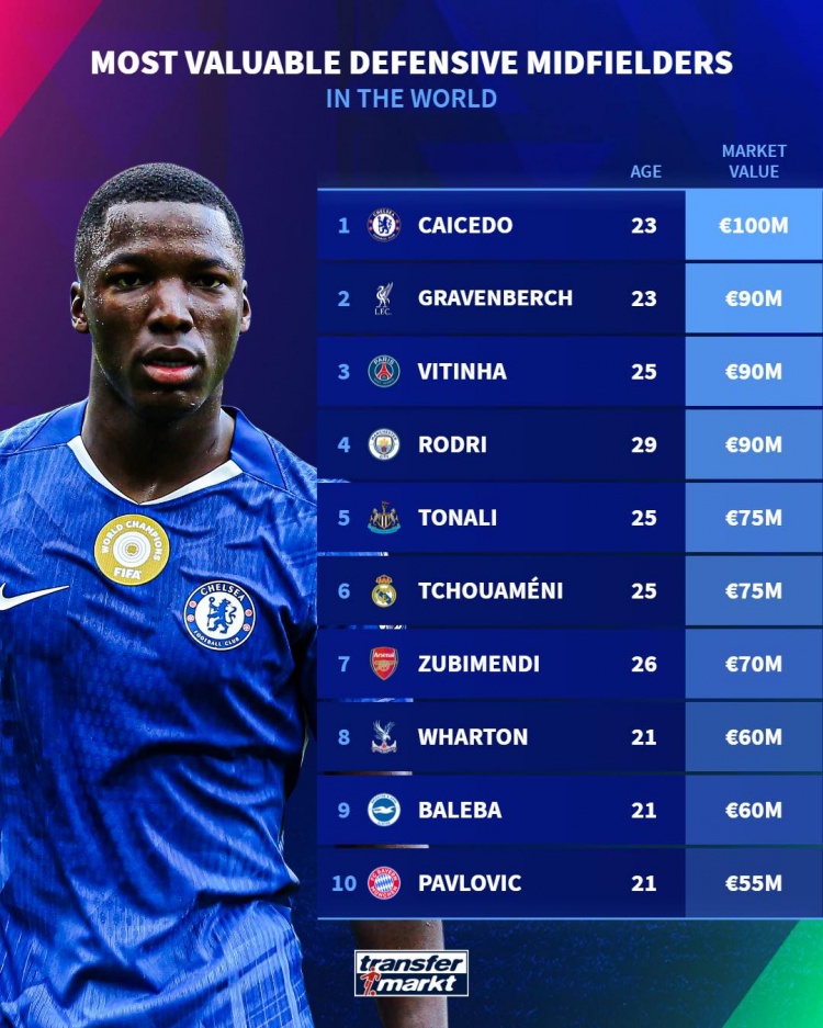 11月2日訊 德國(guó)轉(zhuǎn)會(huì)市場(chǎng)列出了防守型中場(chǎng)身價(jià)排名,凱塞多以1億歐居首。